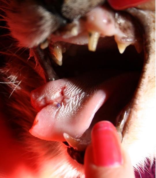 Beim Untersuch wird ersichtlich, dass die Katze offensichtlich Schmerzen im Maul hat, vermehrt speichelt und starken Maulgeruch hat. Das Maul lässt sich wach kaum öffnen, weshalb die Katze ein Narkosemittel erhält. Nun ist das ganze Ausmass des Problems erkennbar: Die Katze hat sich an der rechten Seite der Zunge eine Wunde von wohl 2 cm Länge zugezogen - obwohl schwer nachvollziehbar ist, wie eine solche Verletzung entstehen kann, ist diese doch eindeutig die Ursache für das Verhalten der Katze. Es wird versucht, die Zunge zu nähen (allerdings lösen sich die Fäden innert wenigen Tagen wie befürchtet wieder), Emily wird hospitalisiert, erhält Schmerzmittel und intravenöse Infusionen und wird mit flüssigem Futter versorgt.