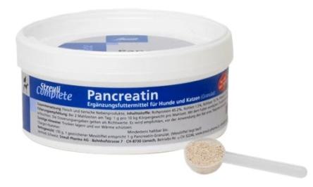 Leo erhält in der Folge einen Futtermittelzusatz, welcher aus getrocknetem Schweine-Bauchspeicheldrüsengewebe besteht. Schon bald verbessert sich der Kot der Katze, Leo nimmt wieder Gewicht zu und zeigt ein schöneres Fell. Da Tiere mit Bauchspeicheldrüsen-Unterfunktion häufig auch einen Mangel an Vitamin B12 zeigen, erhält Leo ausserdem ein entsprechendes Vitaminpräparat. Geplant ist in Kürze, den tatsächlichen Blutwert des Vitamins unter Therapie zu messen. Die Katze wird für den Rest des Lebens das Bauchspeicheldrüsen-Ersatzpulver einnehmen müssen, da sich die Funktion der Bauchspeicheldrüse nicht mehr erholen wird. In aller Regel ist so aber ein normales Leben bei normaler Lebenserwartung möglich.