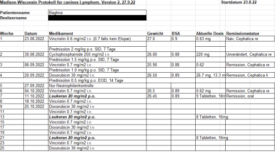 Husten und Allgemeinbefinden von Baghira verbessern sich sehr schnell und die Lymphknoten nehmen wieder normale Grösse an; nach Ausschleichen des Cortisons verschwindet auch der Durchfall. Die zweite Chemotherapiesitzung mit Cyclophosphamid verträgt der Hund aber schlecht, weshalb das Medikament für die restlichen drei Anwendungen durch ein anderes Präparat ersetzt wird, welches problemlos vertragen wird. Blutwerte, Appetit und Allgemeinbefinden von Baghira bleiben während der Chemotherapie sehr gut, so dass (Stand Ende Oktober 22) alle Behandlungen nach Plan durchgeführt werden können.